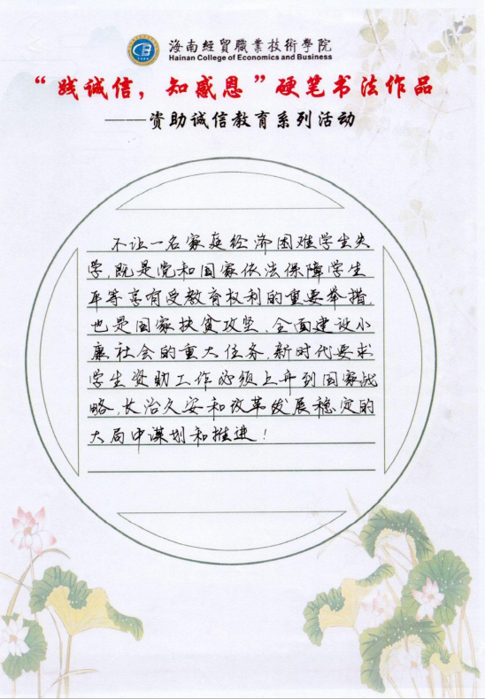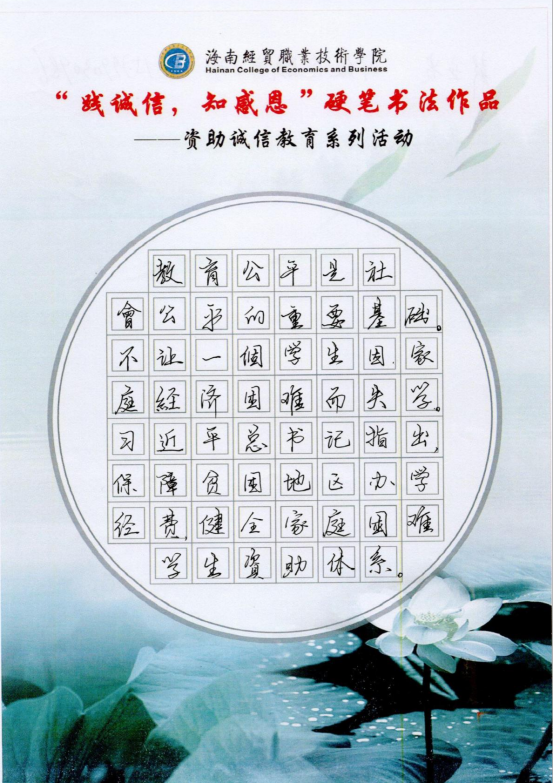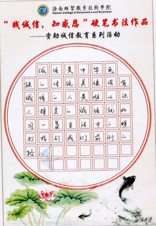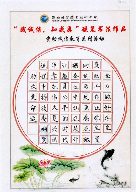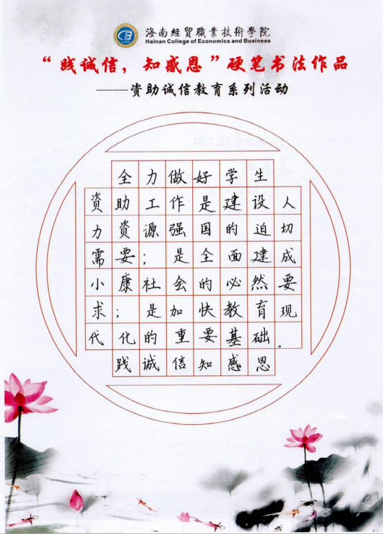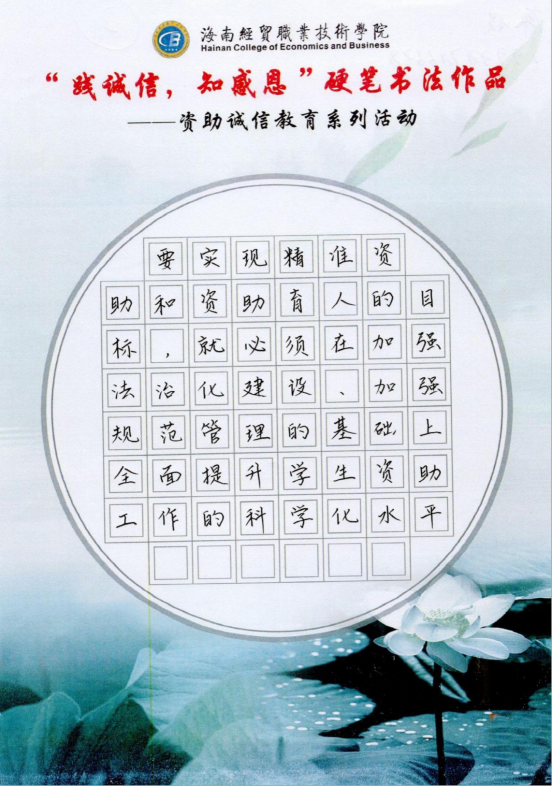 活动通过员工自愿报名,院学习部组织集中书写,辅导员集中评选,最终从一百多张硬笔书法作品中选出26幅精品报送学工处资助科,同时选出50张作品给予院级表彰。